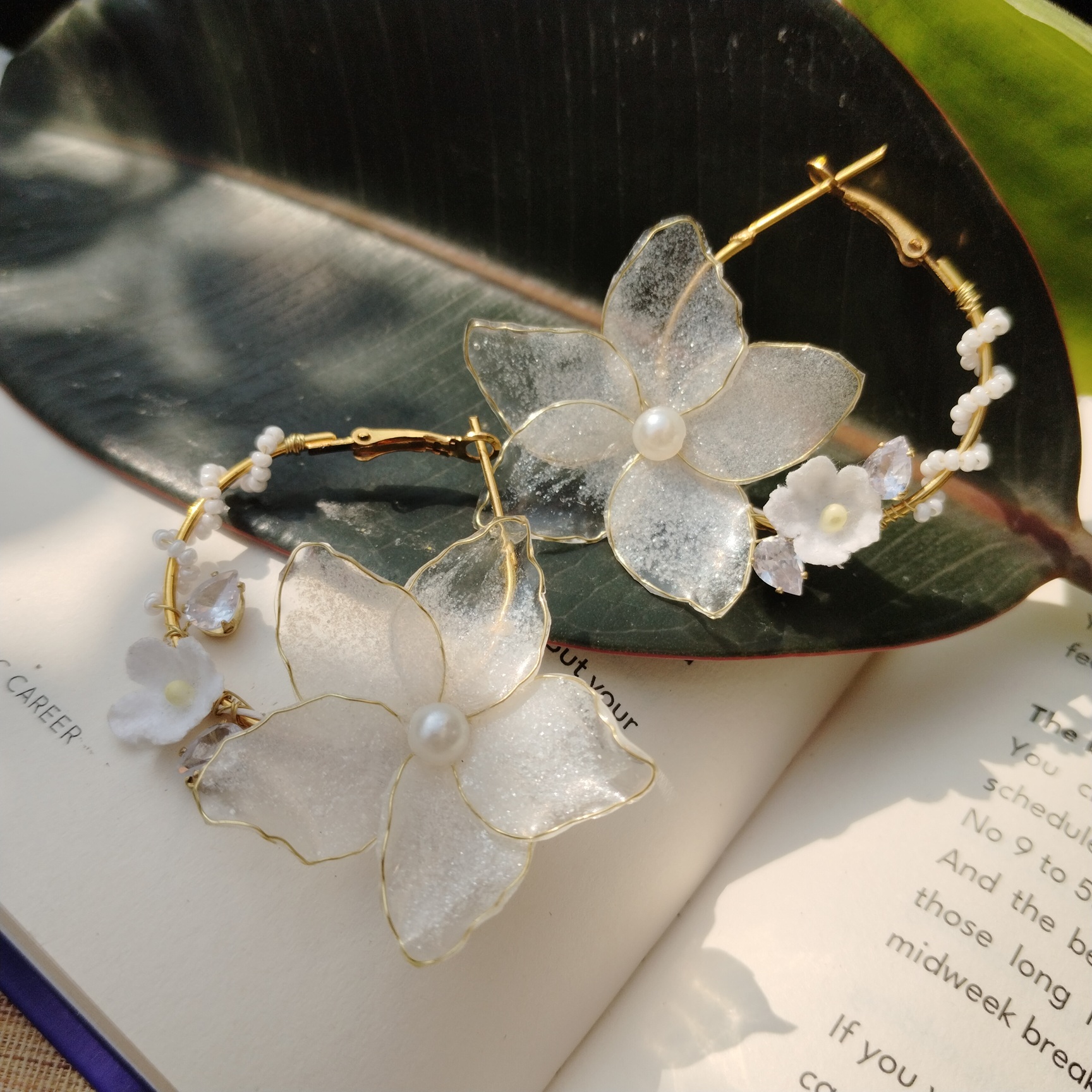 – **A Pair of Earrings**: Flower-shaped beauties featuring delicate white beads and fabric flowers. It’s like wearing a piece of a fairy tale and a garden at the same time!