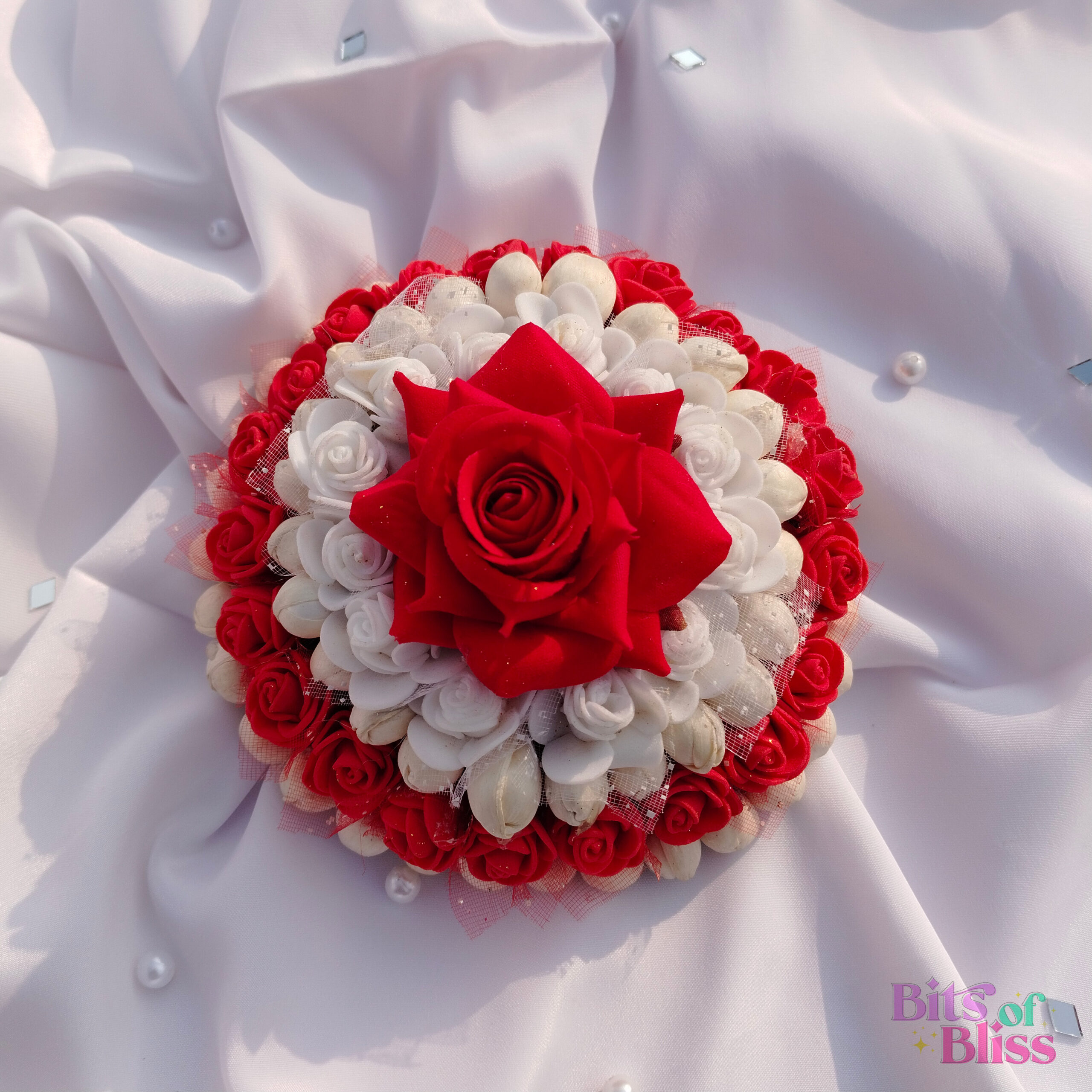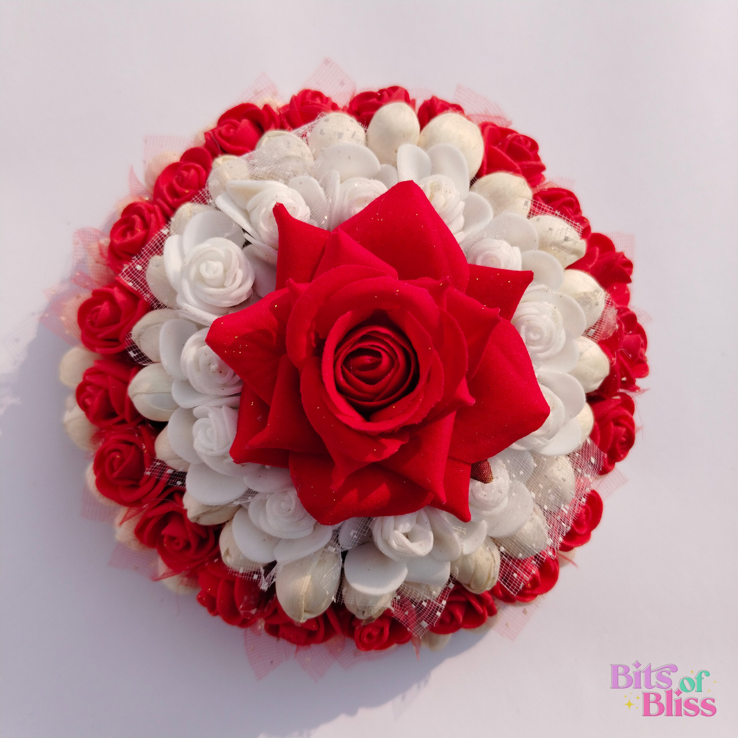 Bring timeless elegance to your look with Komudini, a stunning artificial floral hair bun designed for every special occasion. At its heart is a bold red rose, surrounded by a delicate circle of white blooms, a graceful layer of mogra buds, and an outer ring of vibrant tiny red flowers—a masterpiece of color and charm.